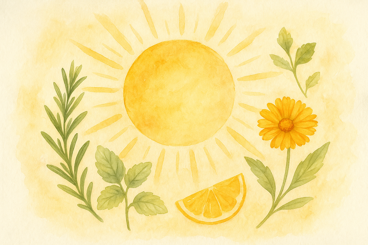 - Romarin : tonique circulatoire, stimule la clarté et l’énergie solaire.