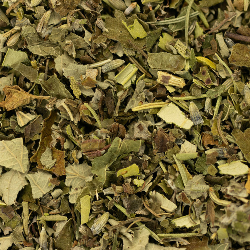 Framboisier feuilles, mûrier feuilles, romarin, mélisse feuilles, fenouil graines, sauge feuilles, olivier feuilles, lavande fleurs
